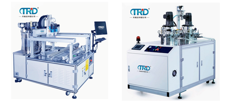 (2)半自動型灌膠機,此類灌膠機可實現于膠水各種比例自動配比,但此類型的灌膠機不帶運動控制平臺,直接將膠注入要灌的產品中,一般適用于LED節能燈,電源。